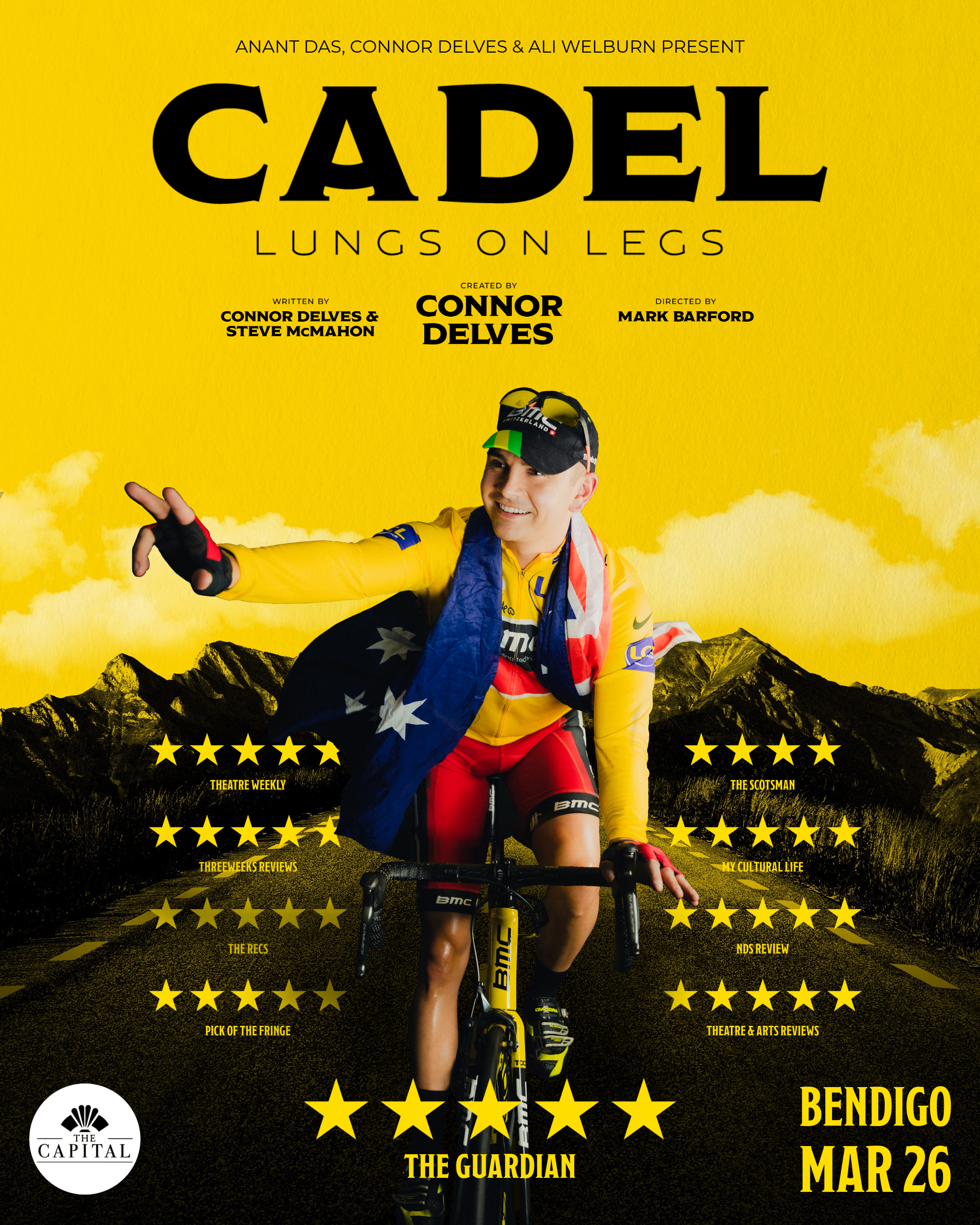 Cadel: Lungs on Legs is a groundbreaking new play set in motion by award-winning Australian actor Connor Delves. Performed entirely on a bicycle, this one man show captures the drive and determination of Cadel Evans and explores his inspiring true story as the first Australian to win the Tour de France.